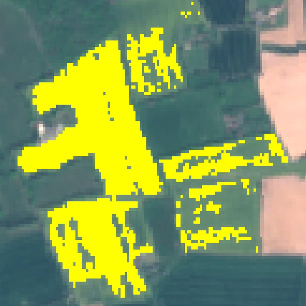 Detecting the presence of Rapeseed is undertaken by thresholding the Normalised Difference Yellowness Index, generated using Sentinel–2 imagery. The presence of yellowness within the land cover indicates the growth of Rapeseed in that area. The following images show how through the use of the Normalised Difference Yellowness Index, we have identified the presence of Rapeseed crops in a host of different countries.