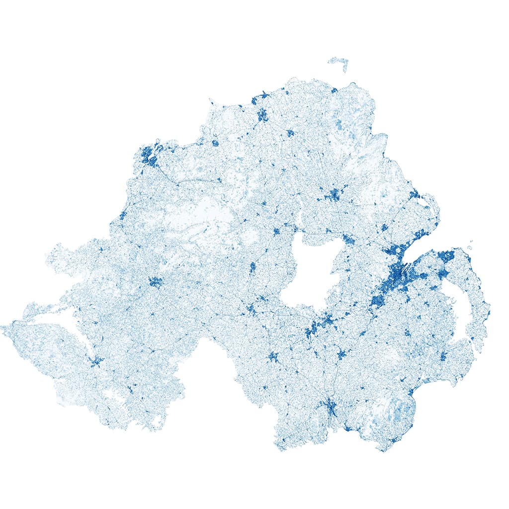 To show how Satellite imagery can be used to detect artificial surfaces, we have created the map below of Northern Ireland, with imagery captured in 2022. This map was generated using three polarisation modes from Sentinel 1 and 10 bands from Sentinel 2, and 6 indexes based on these bands. Any clouds and their shadows were removed using a cloud probability mask, near–infrared band, and solar azimuth angle. Time–series data and a Random Forest machine–learning model were used for classification.