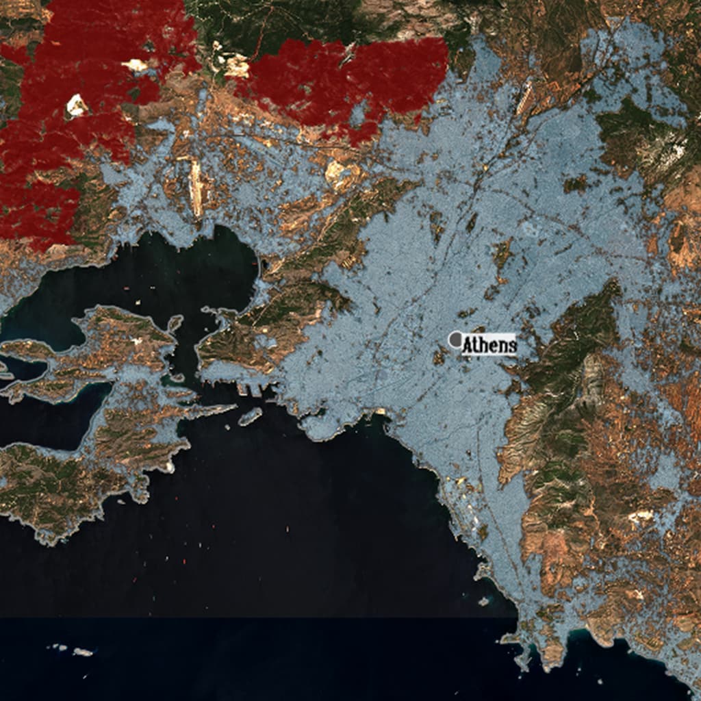The map makes it clear just how close the wildfires made it to the city, almost encircling the residents of Athens.